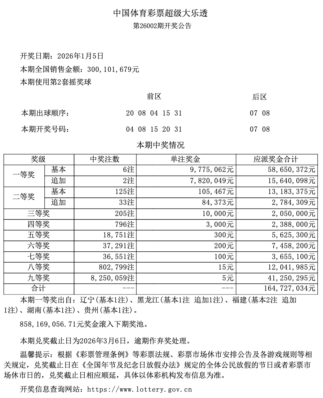 全国总中奖金额