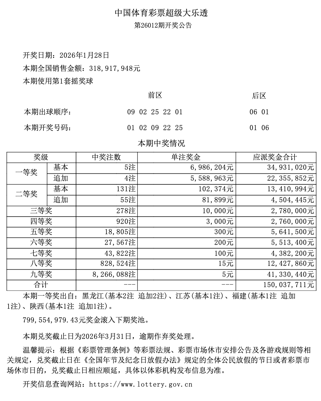 超级大乐透第26012期开奖