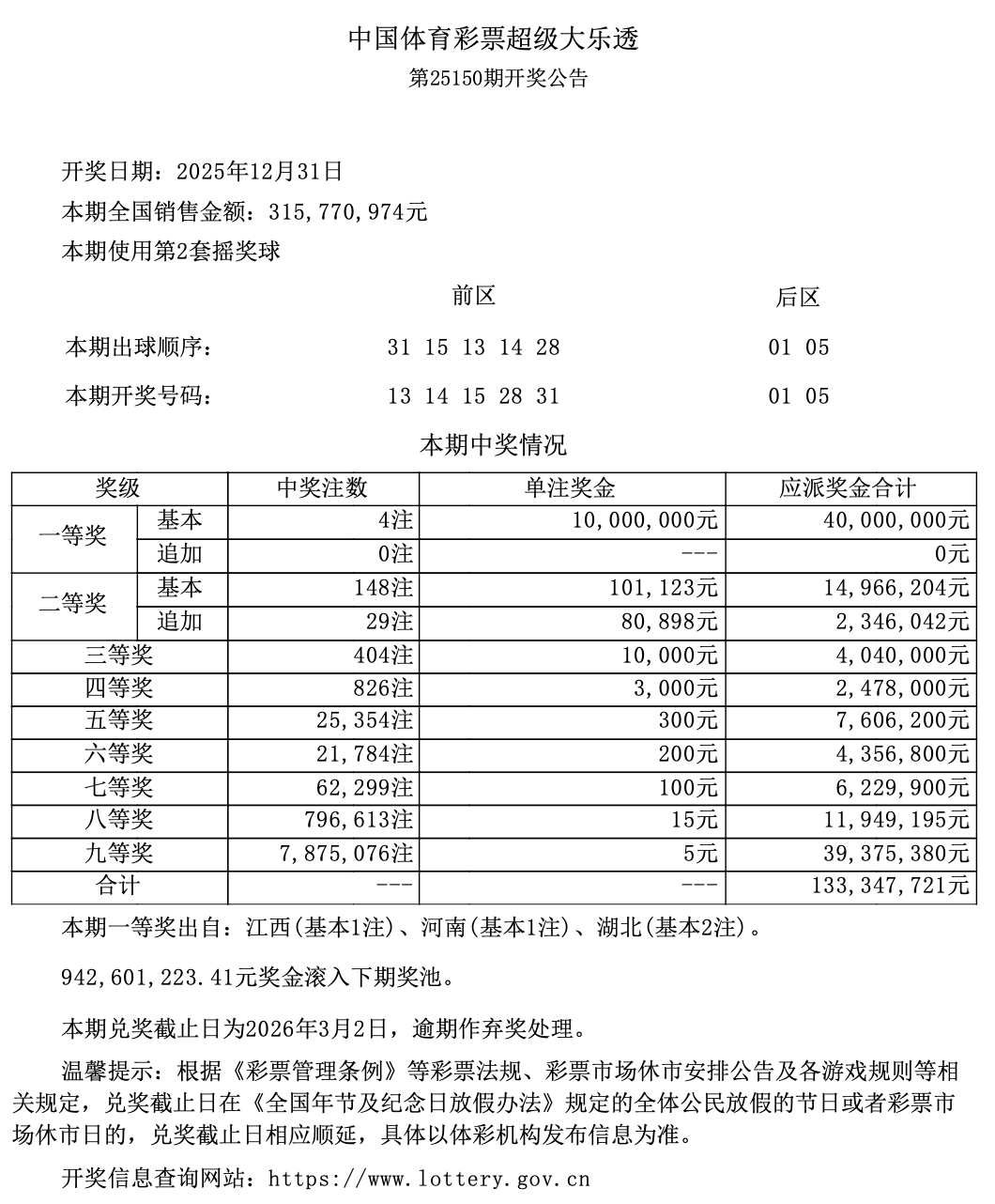 超级大乐透第25150期开奖