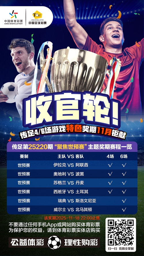 第25220期传足4/6场游戏特色奖期已经于2025年11月16日20:00开售,将于2025年11月18日22:00停售,并于11月19日开奖,其中伊拉克VS阿联酋、奥地利VS波黑、苏格兰VS丹麦、西班牙VS土耳其为4场进球游戏竞猜赛事。