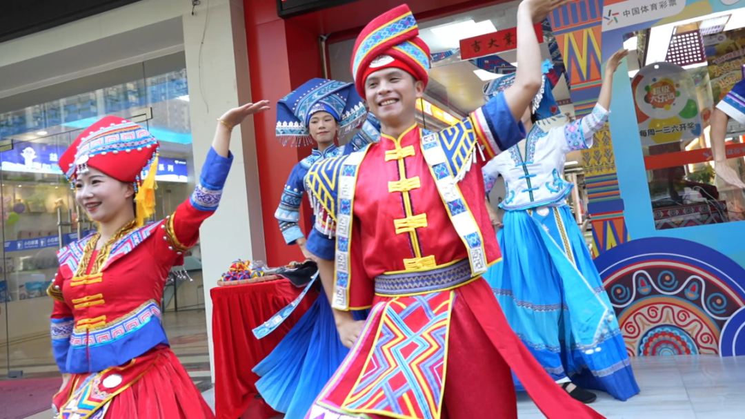 在弘福少数民族特色体彩店门前,别开生面的快闪活动接连上演。