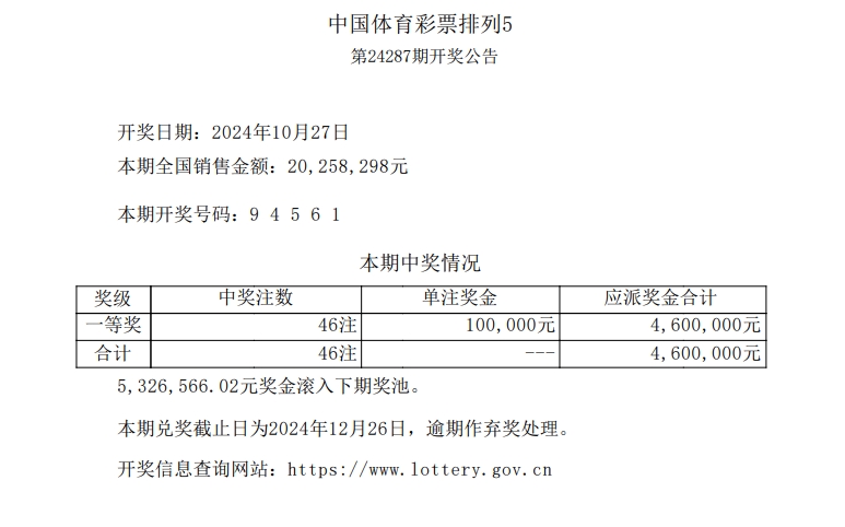排列5 第24287期开奖 9 4 5 6 1