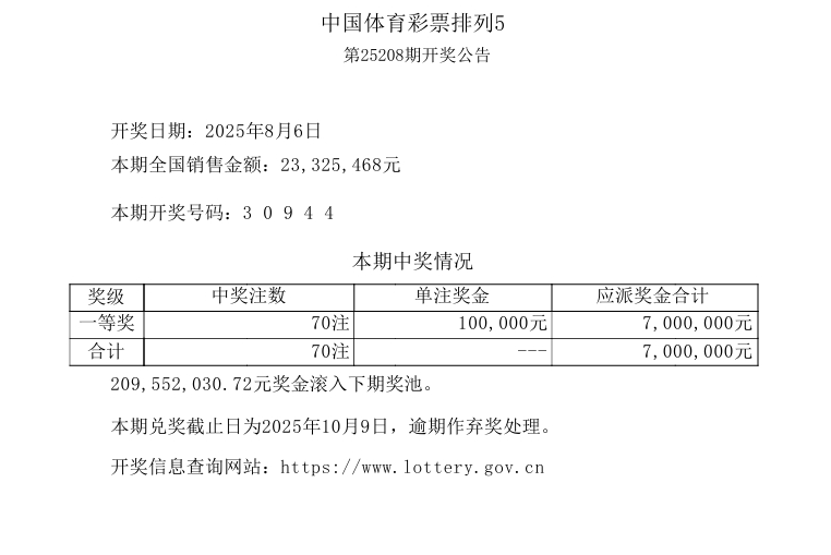排列5 第25208期开奖 3 0 9 4 4