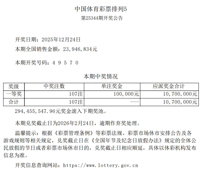 排列5 第25344期开奖 4 9 5 7 0