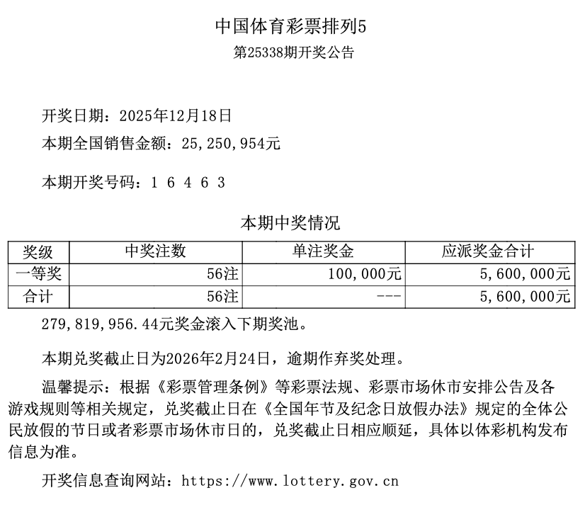 排列5 第25338期开奖 1 6 4 6 3
