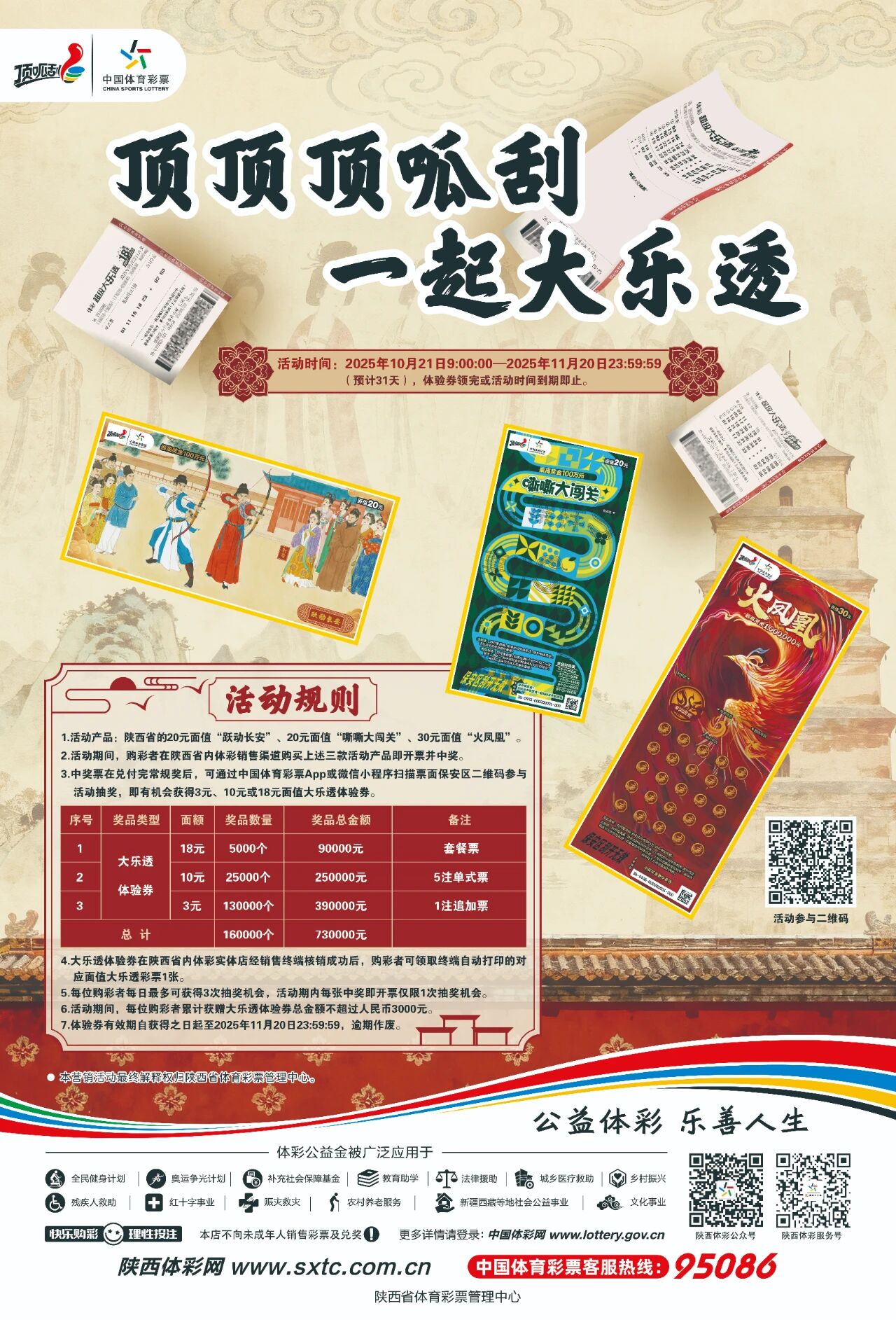如今,“顶顶顶呱刮,一起大乐透”营销活动火热进行中,活动产品“跃动长安”与“嘶嘶大闯关”“火凤凰”。2025年10月21日至2025年11月20日,打开中国体育彩票APP或微信小程序,扫描“跃动长安”“嘶嘶大闯关”“火凤凰”中奖票的保安区二维码,即可参与抽奖,奖品有3元、10元或18元面值的大乐透体验券。每张中奖票仅有1次抽奖机会,每位购彩者每日最多可获得3次抽奖机会。