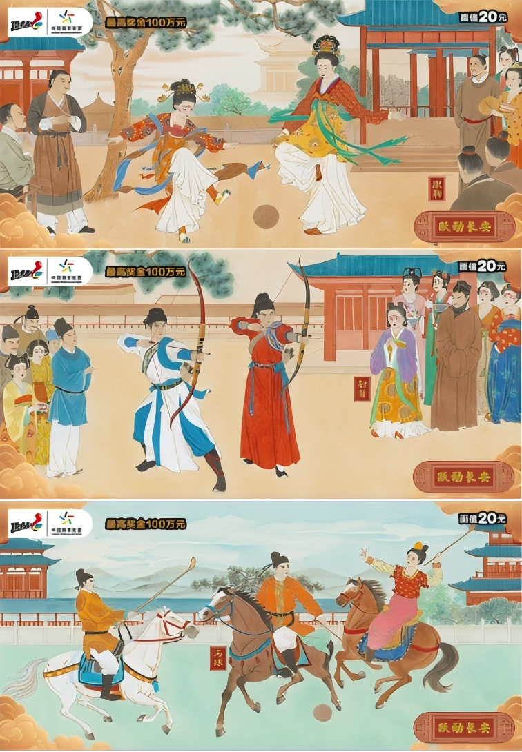 “跃动长安”的设计堪称一场视觉盛宴。其以手绘卡通风格为基底,将温润色调与盛唐元素巧妙融合——蹴鞠少女的灵动身姿、马球选手的昂扬斗志、射箭武者的专注神情,三大唐代代表性运动场景跃然纸上。背景中,宫阙巍峨矗立,祥云缭绕其间,唐韵纹饰勾勒边角,每一处细节都在诉说着十三朝古都的繁华盛景。购彩者纷纷直言:“这张票不只能刮奖,更像件值得收藏的文化纪念品。”