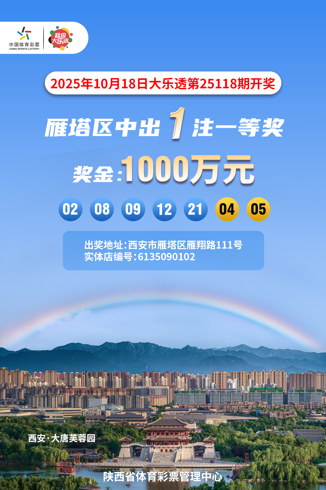 10月18日,超级大乐透2025年10月18日第25118期开奖,陕西中出一等奖1注,每注10000000元,大奖出自西安市雁塔区雁翔路111号,网点编号:6135090102,这也是今年以来我省中得的第24个大乐透一等奖。