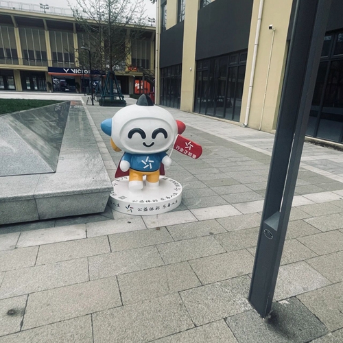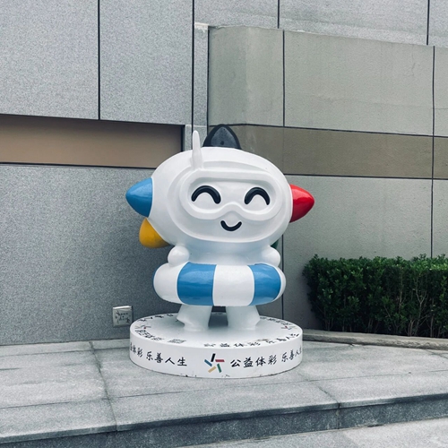 在西安市人民体育场摆放的乐小星雕塑共有十尊,每尊雕塑均配合其所在位置展示了一种运动风采,如游泳馆附近的乐小星雕塑就以水上运动的形态出现——乐小星身套泳圈,面戴护目镜与水肺,将水上运动与水下运动在自己身上做了融合体现。此外,所有乐小星雕塑均有书写着“陕西体彩”“公益体彩 乐善人生”公益标语的底座,当群众因好奇靠近欣赏时,底座上还提供了可供扫描的陕西体彩公众号二维码,做到了让群众第一眼看到乐小星的可爱形象,第二眼便能感受到扑面而来的公益微风。