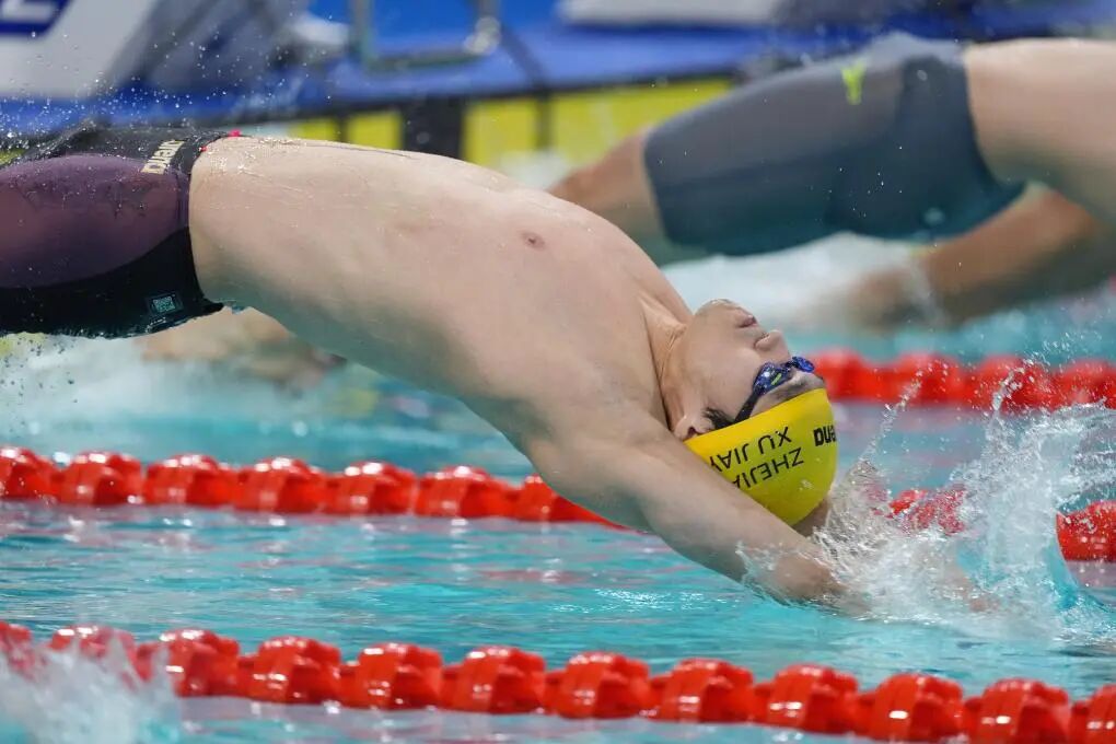 11月17日,第十五届全国运动会游泳男子50米仰泳决赛在广东省深圳市举行,浙江队选手徐嘉余在比赛中出发。