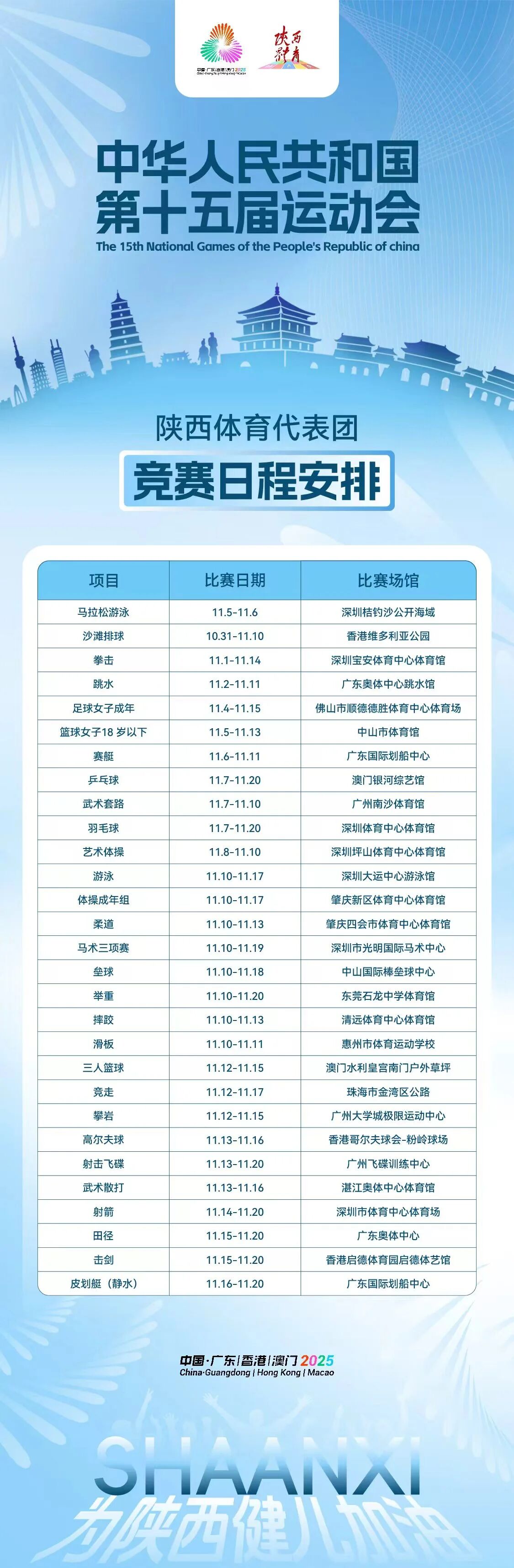 第十五届全运会由广东、香港、澳门三地共同举办,将于11月9日在广州开幕,11月21日在深圳闭幕。竞体比赛项目设34个大项419个小项,群众赛事活动设23个大项166个小项。开闭幕式期间,陕西共有283名运动员参加22个大项27个分项的角逐。距离十五运会开幕仅剩7天时间,参赛运动员将逐一亮相,一起为陕西健儿们加油!
