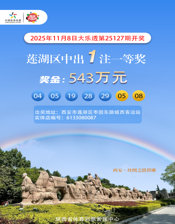 11月8日超级大乐透第25127期开奖,陕西中出一等奖1注,每注5,427,642.00元,大奖出自莲湖区枣园东路城西客运站39号,网点编号:6133080087,这也是今年以来我省中得的第27个大乐透一等奖。中奖者张女士(化姓)已于11月10日前往省体彩中心顺利完成兑奖。