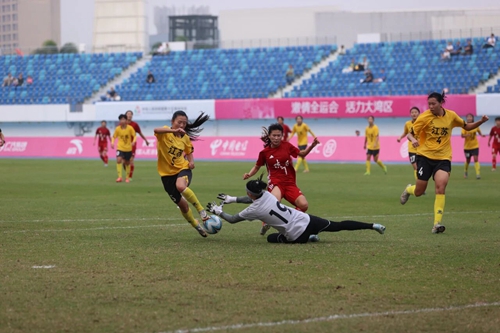 第十五届全国运动会女足成年组C组末轮陕西队与江苏队的比赛11月8日在佛山市南海体育中心进行。面对小组头名江苏队,陕西女足展现出顽强斗志,以0:0战平对手,位列小组第三,最终以2个成绩最好的第三名之一成功晋级八强。