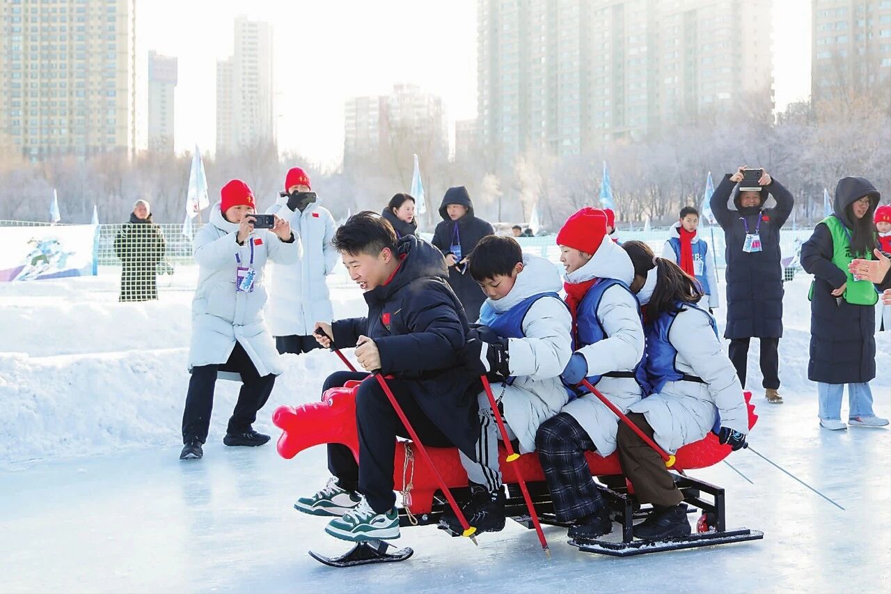 带着这份精神力量,少年们奔赴冰雪赛场。本次大会秉持“淡化名次、奖牌,突出趣味性”的理念,设置花样滑冰、3对3冰球、速度滑冰、单板滑雪回转、越野滑雪短距离5项比赛,以及雪地拔河、冰上龙舟、雪合战等趣味体验项目,让不同基础的青少年都能在冰雪中找到快乐。在自治区冬季运动训练中心的冰场上,花样滑冰选手翩若惊鸿,速度滑冰选手飞驰而过;乌鲁木齐市第十五中学冰球场上,3对3冰球对抗激烈精彩;在南湖市民广场的雪地里,雪合战、冰上龙舟等项目则吸引了参赛选手和市民共同参与,欢声笑语不断。对于许多来自南方的青少年来说,这次大会是一场“冰雪初体验”。“这是我第一次来新疆,也是第一次感受下雪天,很开心!”澳门队队员袁启诺兴奋地说,“我参加了冰球比赛,希望能结识很多新朋友。”浙江队队员马梓嫣则对开幕式上的毛皮滑雪板表演印象深刻:“妈妈给我看过视频,没想到能亲眼见到实物!新疆的雪太美了,比赛结束后我一定要去滑雪。”2024年巴黎奥运会花样游泳集体项目冠军张雅怡说:“看着孩子们的身影就能感受到青少年对冰雪运动的热爱最纯粹也最有感染力,他们在场上的每一次尝试、每一次突破,都让我看到了中国冰雪运动的蓬勃未来。希望这场盛会能成为他们逐梦路上的重要一站,让冰雪热情一直延续下去。”