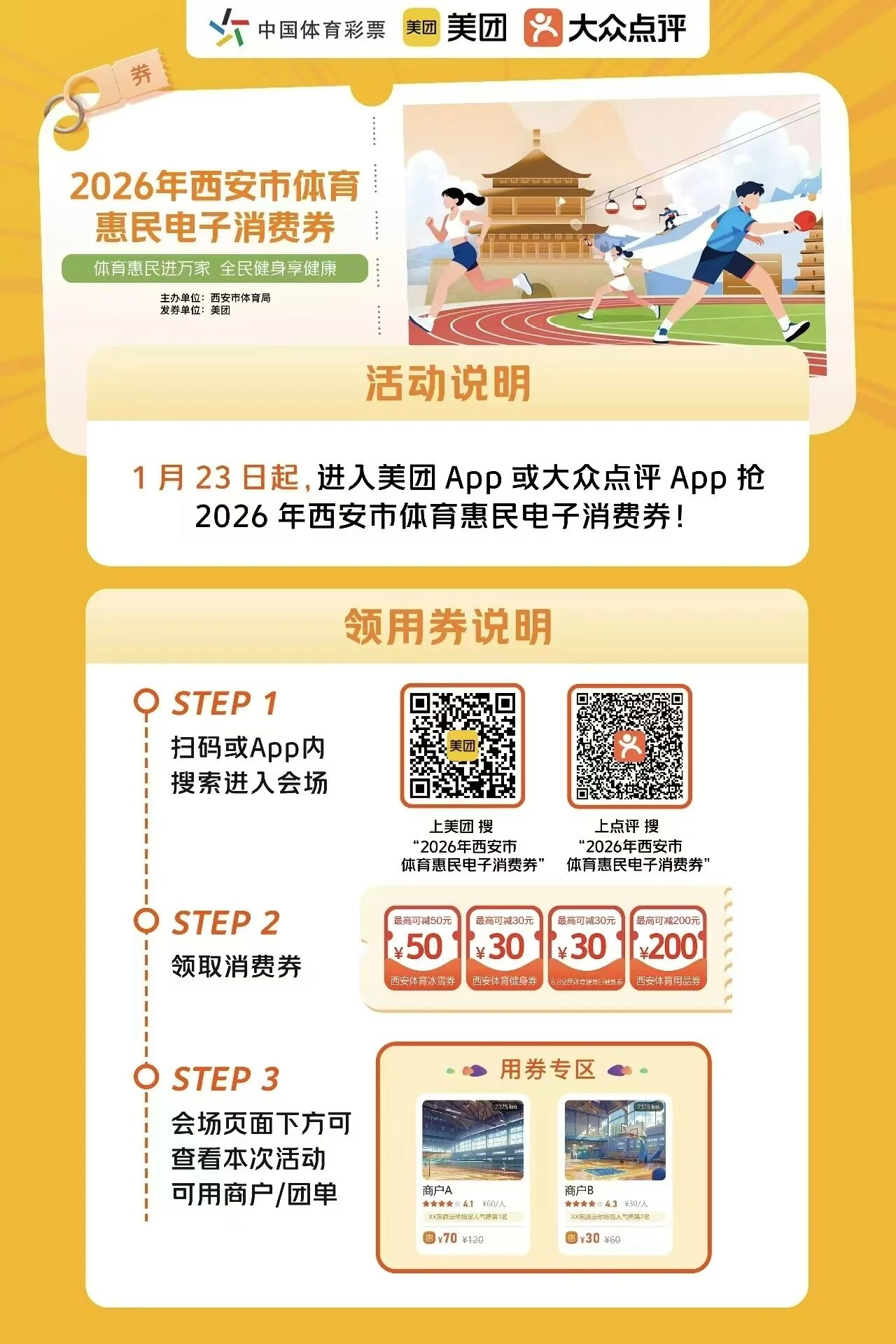 发放体育惠民消费券,是西安市体育局落实惠民政策、繁荣体育市场、服务市民健身的重要举措。通过政府引导、商家让利、群众受益的模式,进一步降低市民运动消费成本,带动全民健身热情,营造全民健身、乐享新春的浓厚氛围,以体育活力为西安春节增添健康亮色。