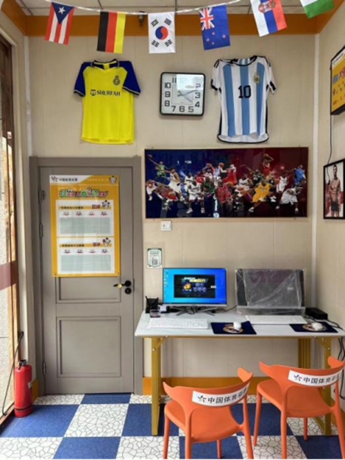 马健的新店有 35 平米,通过与同行交流,精心设计,在必备的体彩元素基础上,增加了很多竞猜风格的元素,大力神杯、足球精美的博古架、历届经典时刻的足球比赛风格海报和装饰画,更是将自己和店内购彩者喜欢的足球球衣悬挂在墙上作为点缀,还有氛围浓厚的万国旗,将整个店面氛围拉满。
