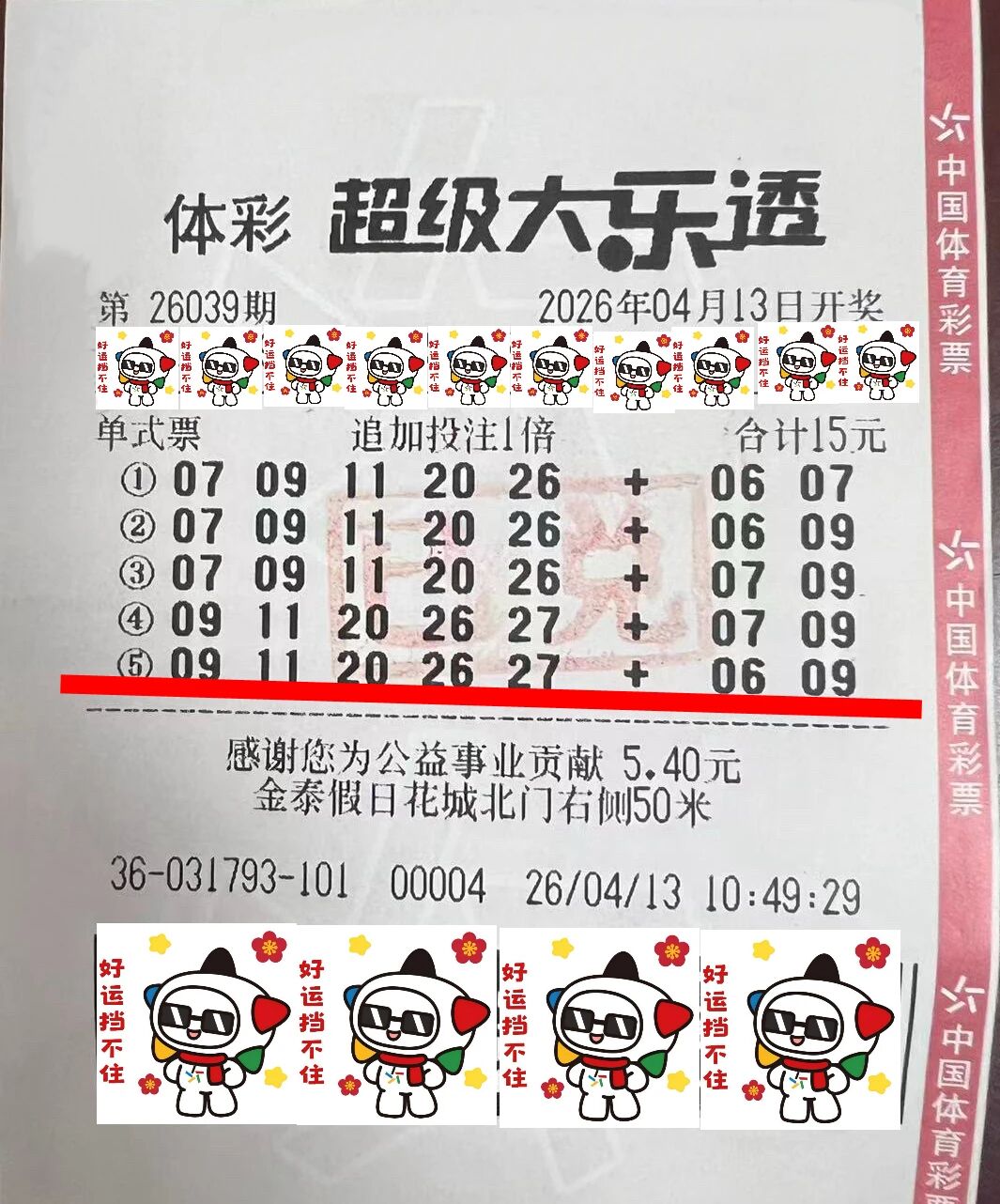 2026年4月13日超级大乐透第26039期开奖,陕西省中出1注追加一等奖,奖金1029万元。大奖出自西安市雁塔区金泰假日花城北门右侧50米的体彩店,实体店编号:6136031793。这是2026年我省中出的第10个大乐透大奖。