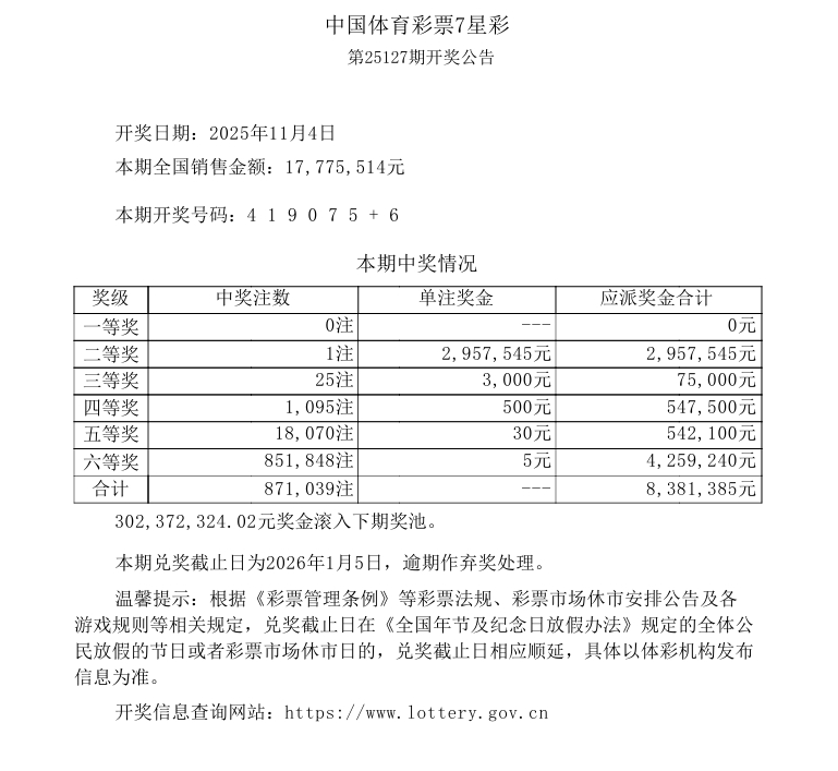 第25127期开奖公告