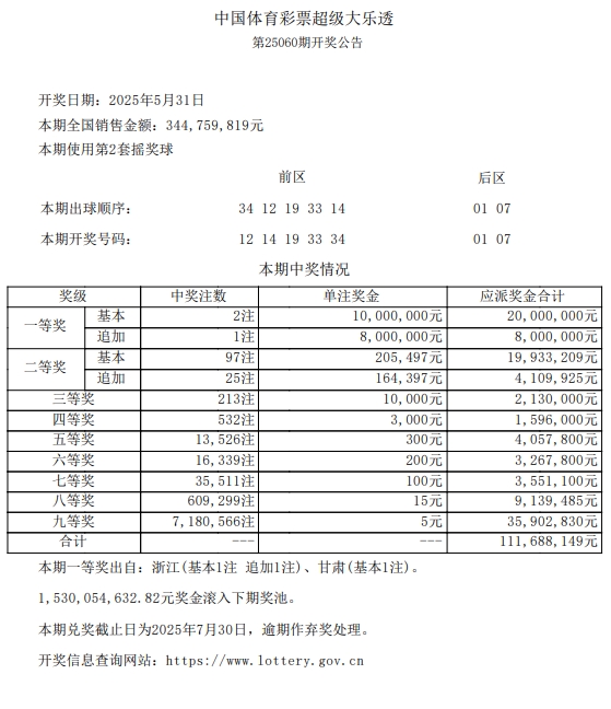 奖池资金累计1530054632.82元奖