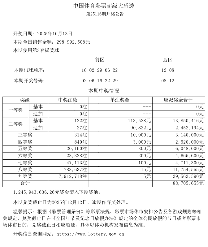 奖池资金累计1245943636.26元奖