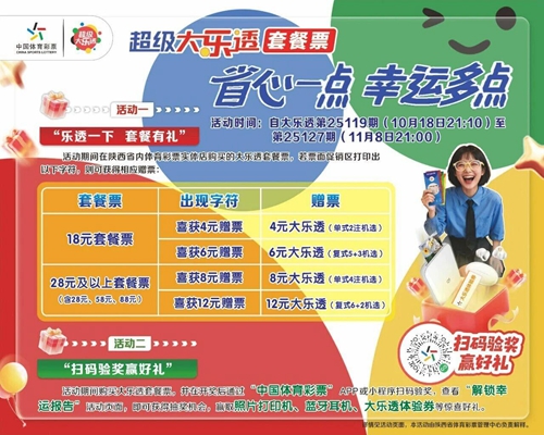 抽奖福利:在10月20日至11月8日期间,购买大乐透套餐票,并在开奖后通过“中国体育彩票”APP或小程序扫码验奖,查看“解锁幸运报告”活动页面,即可获得抽奖机会,赢取照片打印机、蓝牙耳机、大乐透体验券等惊喜好礼。活动期间用户获得的抽奖机会仅限当天有效,过期失效。中奖者可登录“中国体育彩票”APP或小程序,点击【我的】—【我的奖品】查看中奖记录。