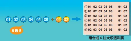 以最简单的前区6+2的复式投注模式来具体讲解一番01、02、03、04、05、06 + 01、02可以组合成: