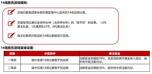 是不是很想更详细地了解我呢?“14场胜负游戏”作为传足4种游戏中的销冠,很荣幸今天借机能介绍下自己,我是以中国足球彩票胜负玩法所选择的足球比赛场次为竞猜对象,购买“胜负游戏”时,由购买者从中国足球彩票胜负玩法选择的所有竞猜场次每场比赛在全场90分钟(含伤停补时)比赛的胜平负的结果进行投注,对于所选竞猜场次的比赛成绩均只选择1种预测结果为单式投注,对于某一竞猜场次的比赛成绩选择2种(含)以上的预测结果为复式投注。购买者可对其选定的结果进行多倍投注,投注倍数范围为2-99倍。