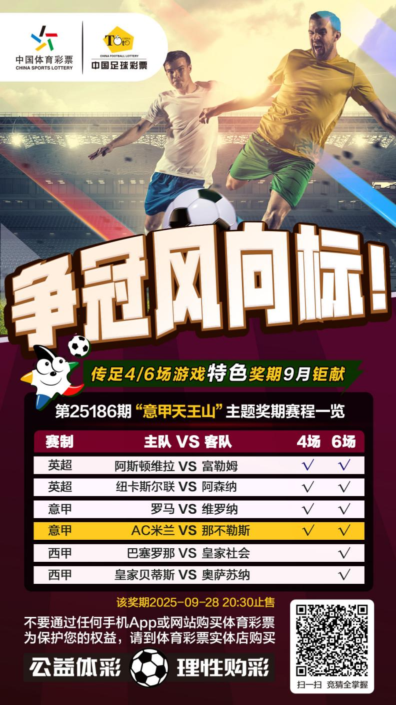 第25186期传足4/6场游戏特色奖期已经于2025年9月24日20:00开售,将于2025年9月28日20:30停售,并于9月29日开奖,其中阿斯顿维拉VS富勒姆、纽卡斯尔联VS阿森纳、罗马VS维罗纳、AC米兰VS那不勒斯为4场进球游戏竞猜赛事。