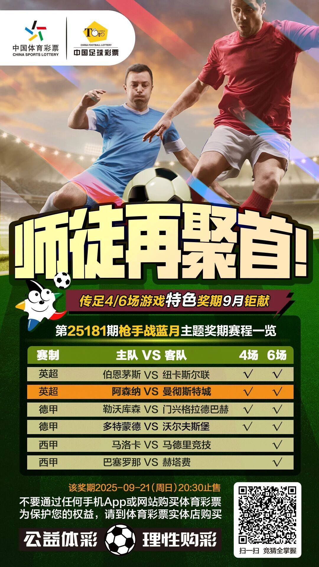 第25181期传足4/6场游戏特色奖期已经于2025年9月17日20:00开售,将于2025年9月21日20:30停售,并于9月22日开奖,其中伯恩茅斯VS纽卡斯尔联、阿森纳VS曼彻斯特城、勒沃库森VS门兴格拉德巴赫、多特蒙德VS沃尔夫斯堡为4场进球游戏竞猜赛事。