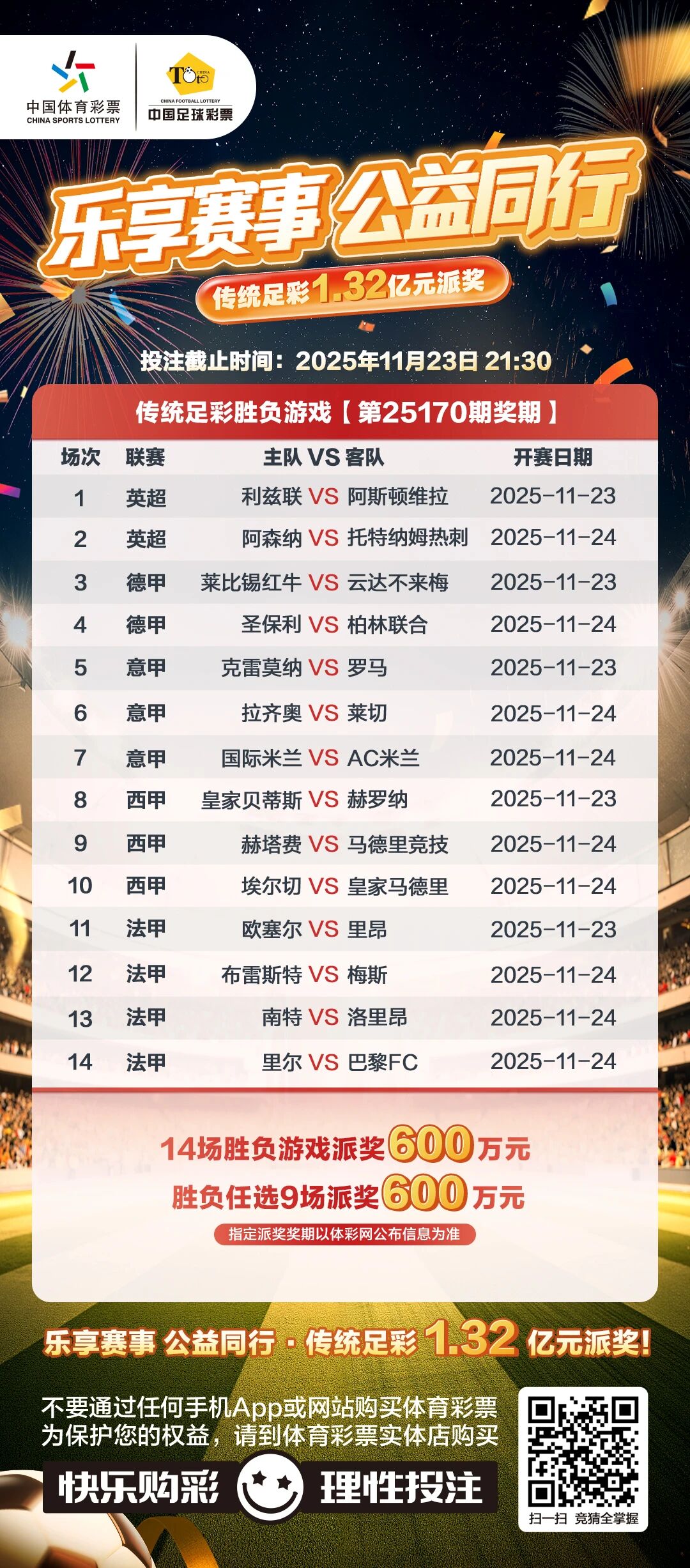 本期同样是传足派奖奖期,14场胜负游戏和任选9场游戏分别派奖600万元,提醒喜欢传足的小伙伴们理性参与。