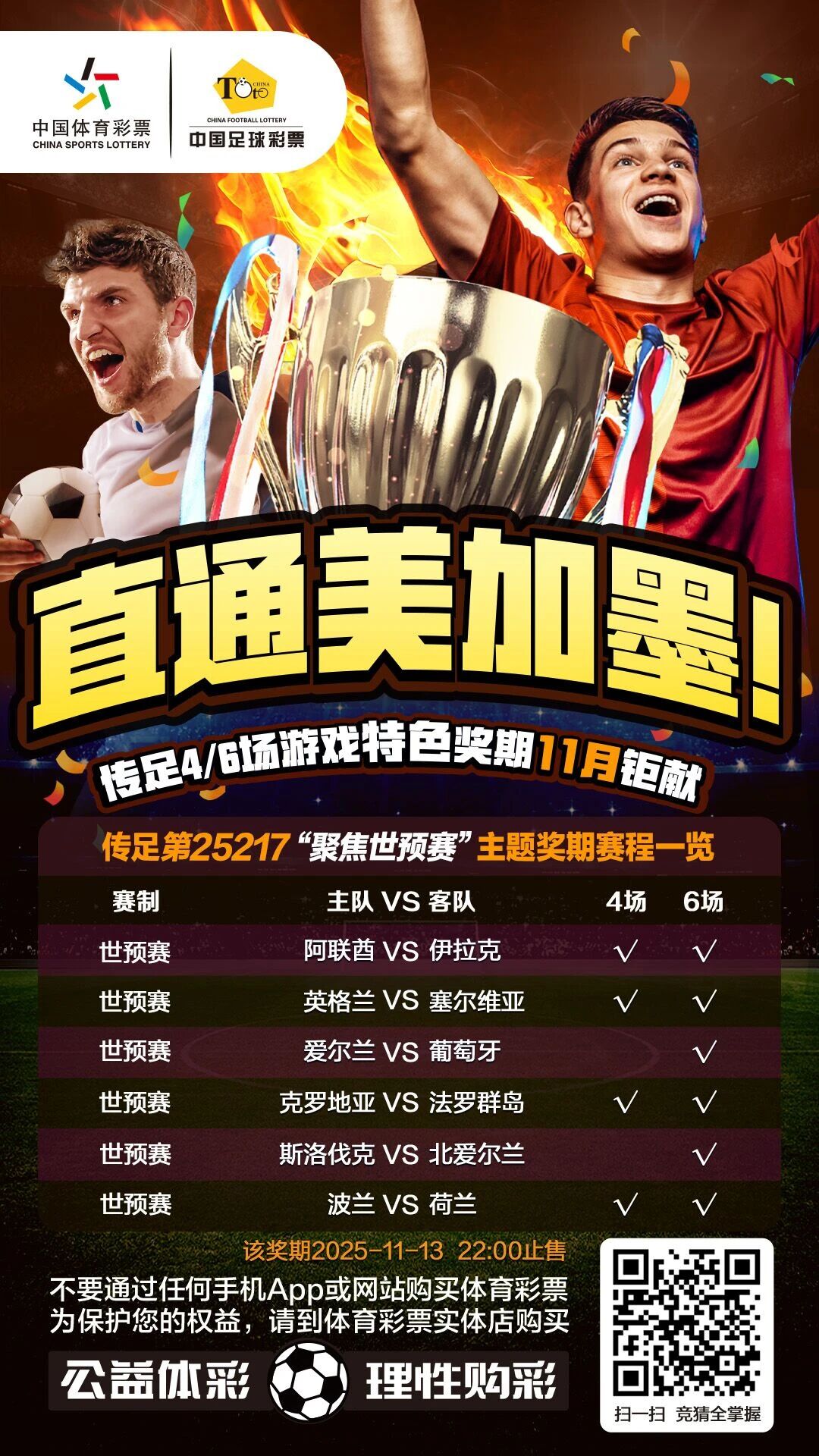 第25217期传足4/6场游戏特色奖期已经于2025年11月9日20:00开售,将于2025年11月13日22:00停售,并于11月15日开奖,其中阿联酋VS伊拉克、英格兰VS塞尔维亚、克罗地亚VS法罗群岛和波兰VS荷兰为4场进球游戏竞猜赛事。
