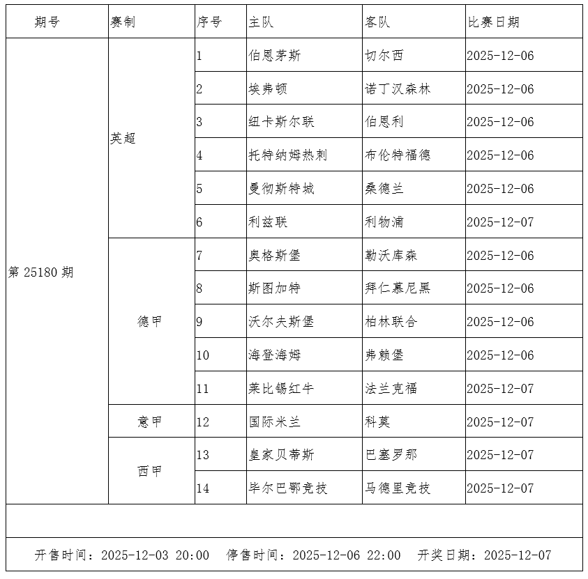本周末派奖继续,传足胜负彩和任选9场第25180期游戏分别派奖600万元,提醒有兴趣的购彩者理性参与。本期竞猜场次中,曼城将在主场迎战黑马桑德兰,表现依旧坎坷的利物浦客场对阵利兹联。德甲领头羊拜仁和西甲领头羊巴萨也将奔赴客场作战,对手分别是斯图加特和皇家贝蒂斯。