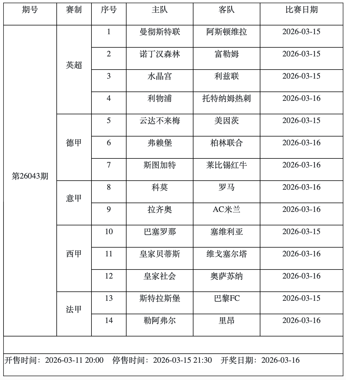 周日传足胜负彩26043期的竞猜对阵赛程中看点不少。其中,英超方面,曼联主场对阵维拉,欧冠双双失利的利物浦和热刺展开交战,意甲方面,AC米兰做客拉齐奥,西甲,巴萨则主场面对塞维利亚。