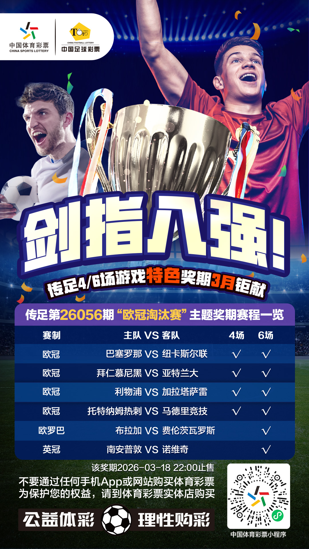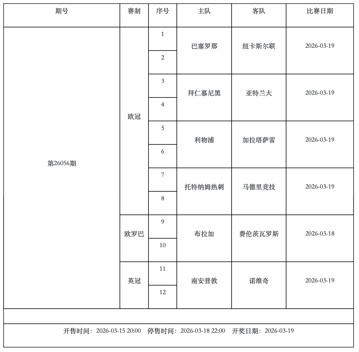 第26056期传足4/6场游戏特色奖期已经于2026年3月15日20:00开售,将于2026年3月18日22:00停售,并于2026年3月19日开奖,其中巴塞罗那VS纽卡斯尔联、拜仁慕尼黑VS亚特兰大、利物浦VS加拉塔萨雷、托特纳姆热刺VS马德里竞技为4场进球游戏竞猜赛事。