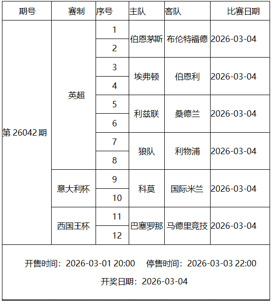 第26042期传足4/6场游戏特色奖期已经于2026年3月1日20:00开售,将于2026年3月3日22:00停售,并于2026年3月4日开奖,其中伯恩茅斯VS布伦特福德、埃弗顿VS伯恩利、利兹联VS桑德兰、狼队VS利物浦为4场进球游戏竞猜赛事。