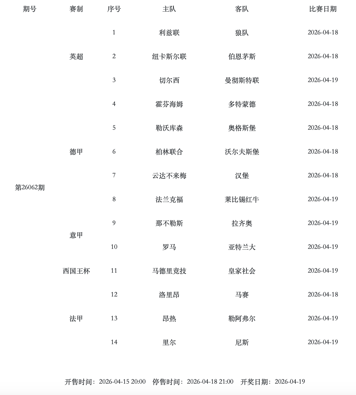 本周六,欧洲赛事继续激战。传足胜负彩第26062期的竞猜场次中,切尔西与曼联的英超对决尤为引人关注。其他如多特蒙德将在客场对阵霍芬海姆,那不勒斯迎战拉齐奥,刚刚晋级欧冠四强的马竞技,将在西班牙国王杯决赛中与皇家社会展开交锋。