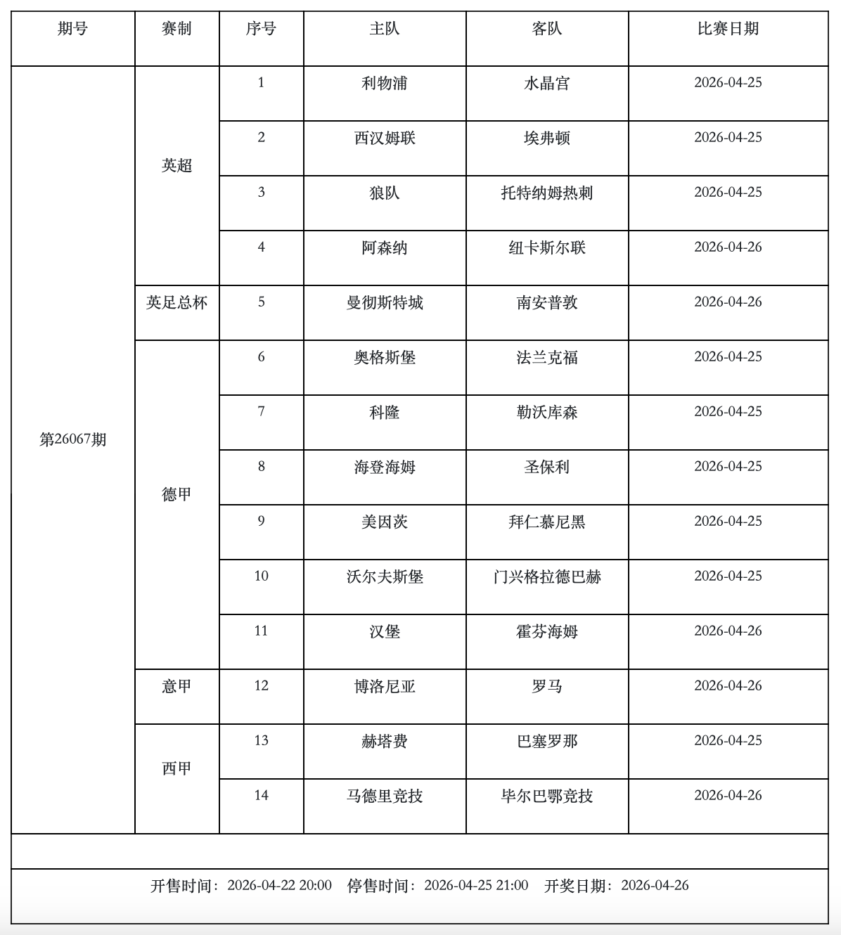 本周六传足胜负彩第26067期的竞猜对阵中,涉及欧陆豪门球队的赛事不乏看点,对比拜仁提前夺冠的德甲,巴萨领先优势巨大的西甲,英伦赛场上的竞争更为激烈。