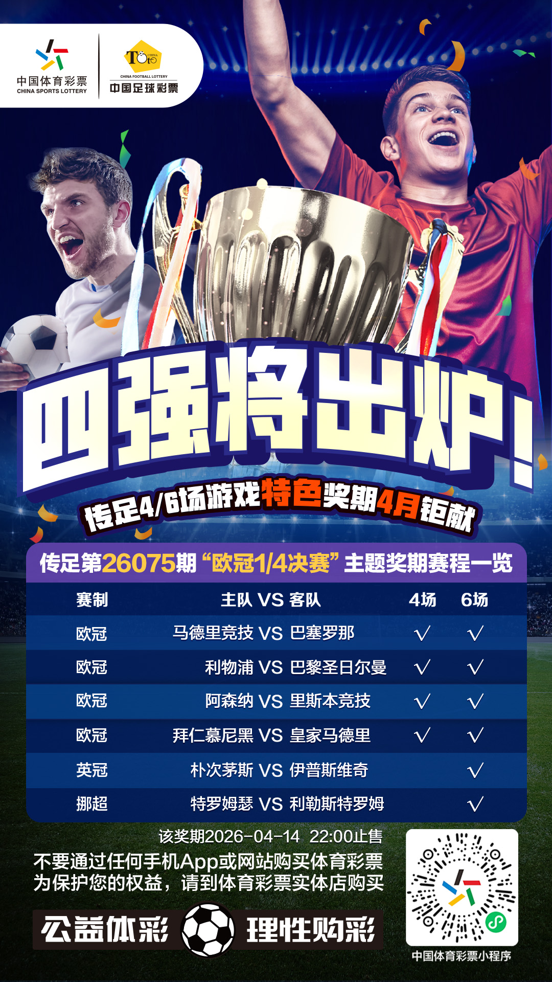 第26075期传足4/6场游戏特色奖期已经于2026年4月12日20:00开售,将于2026年4月14日22:00停售,并于2026年4月16日开奖,其中马德里竞技VS巴塞罗那、利物浦VS巴黎圣日尔曼、阿森纳VS里斯本竞技、拜仁慕尼黑VS皇家马德里为4场进球游戏竞猜赛事。