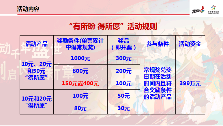 更让人惊喜的是,针对“得所愿”即开新票,陕西体彩还同步开展了“有所盼 得所愿”赠票活动。活动时间于2025年11月11日—2025年12月8日截止,凡在陕西省内体彩店购买面值10、20、50元“得所愿”的顾客,单张彩票累计中得1000元,赠送300元即开票,单张彩票累计中800元,赠送200元即开票,单张彩票累计中150或400元,赠送100元即开票;购买面额10元和20元“得所愿”单张累计中100元,赠送50元即开票,单张中80元,赠送30元即开票。