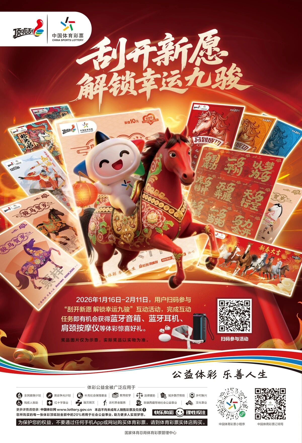 体彩顶呱刮马年生肖贺岁票,“新春大吉2026、抢头彩2026、马到成功、骏马贺岁、午马”已如约而至,将生肖意蕴与公益使命凝于方寸之间。即日起至2月11日期间,“刮开新愿,解锁幸运九骏”以马年生肖票为载体,通过趣味互动与社交分享,打造全国线上线下联动活动,传播特色体彩新春祝福,增强品牌亲和力。