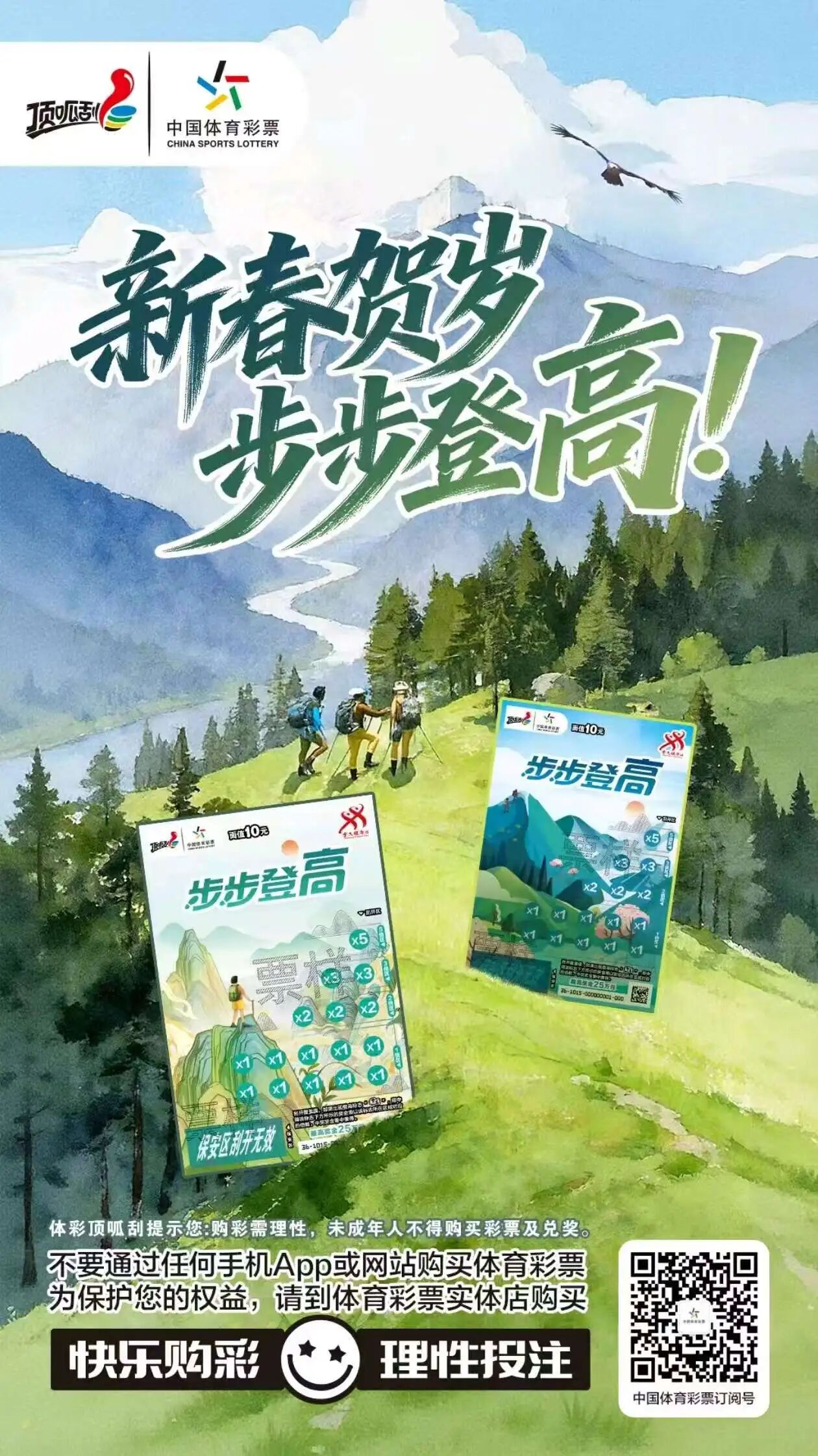 春日登高,不仅是亲近自然的仪式,更是对生活“向上”的向往。“步步登高”将这份向往具象化:攀登的身影寓意着勇攀高峰的勇气,层层山峦象征着步步向好的人生,而每一次刮奖的惊喜,则是对这份勇气与向往的温柔回应。无论是周末约上好友徒步山野,还是闲暇时在体彩店驻足片刻,一张“步步登高”都能成为连接自然与幸运的纽带,让春日的快乐加倍。