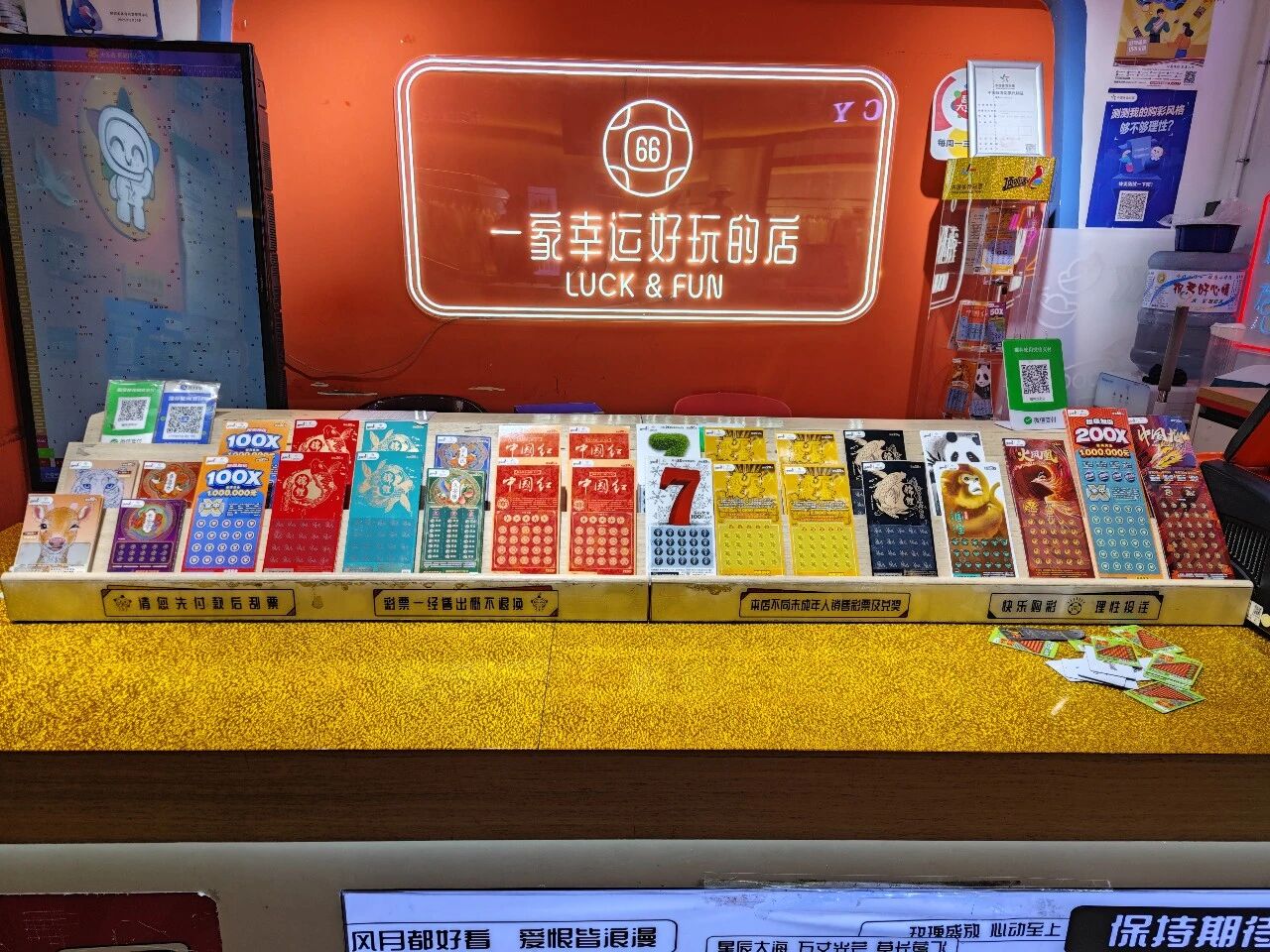 他着力优化门店展示效果,专门设置顶呱刮专属陈列区,按价位和主题整齐摆放,票面醒目直观。结合延安特色元素和暖色系店面装饰,营造轻松热闹的氛围,同时保持点位干净整洁,让路过客流愿意驻足了解。