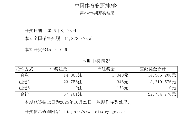 排列3 第25225期开奖 0 0 9