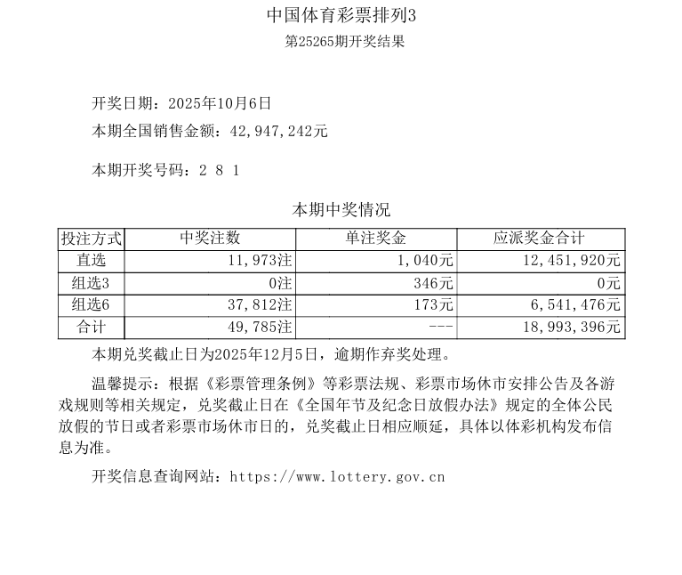 排列3 第25265期开奖 2 8 1