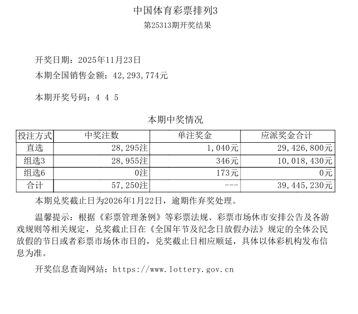 排列3 第25313期开奖 4 4 5
