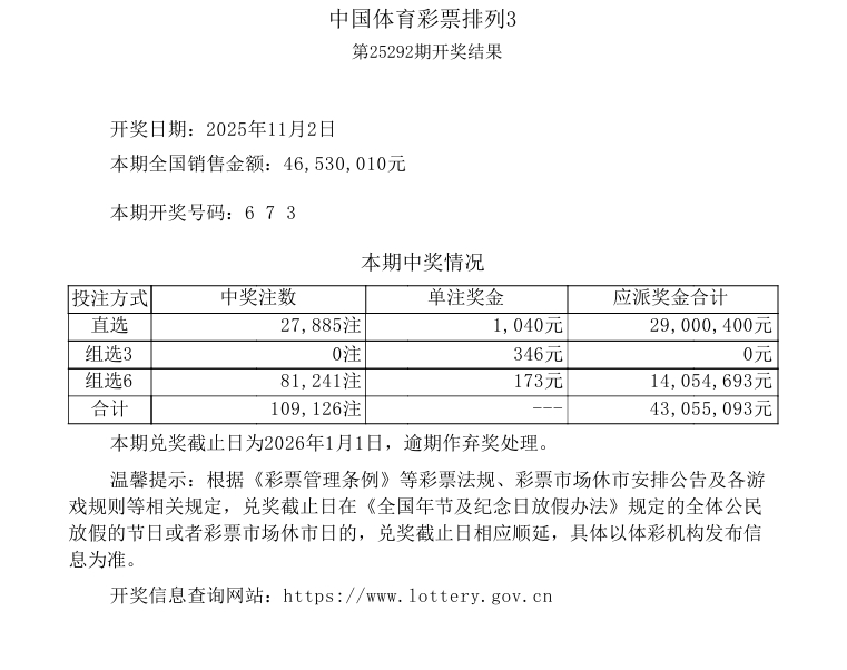 排列3 第25292期开奖 6 7 3
