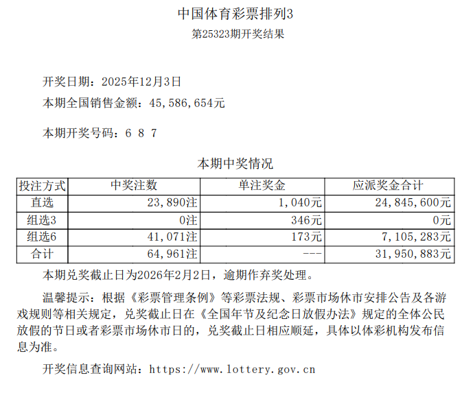 排列3 第25323期开奖 6 8 7