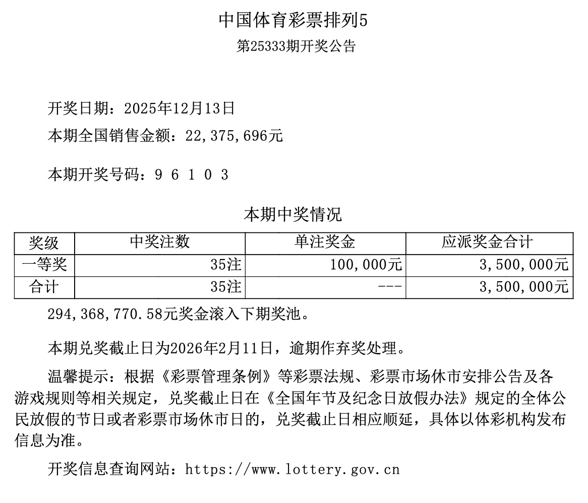 排列5 第25333期开奖 9 6 1 0 3