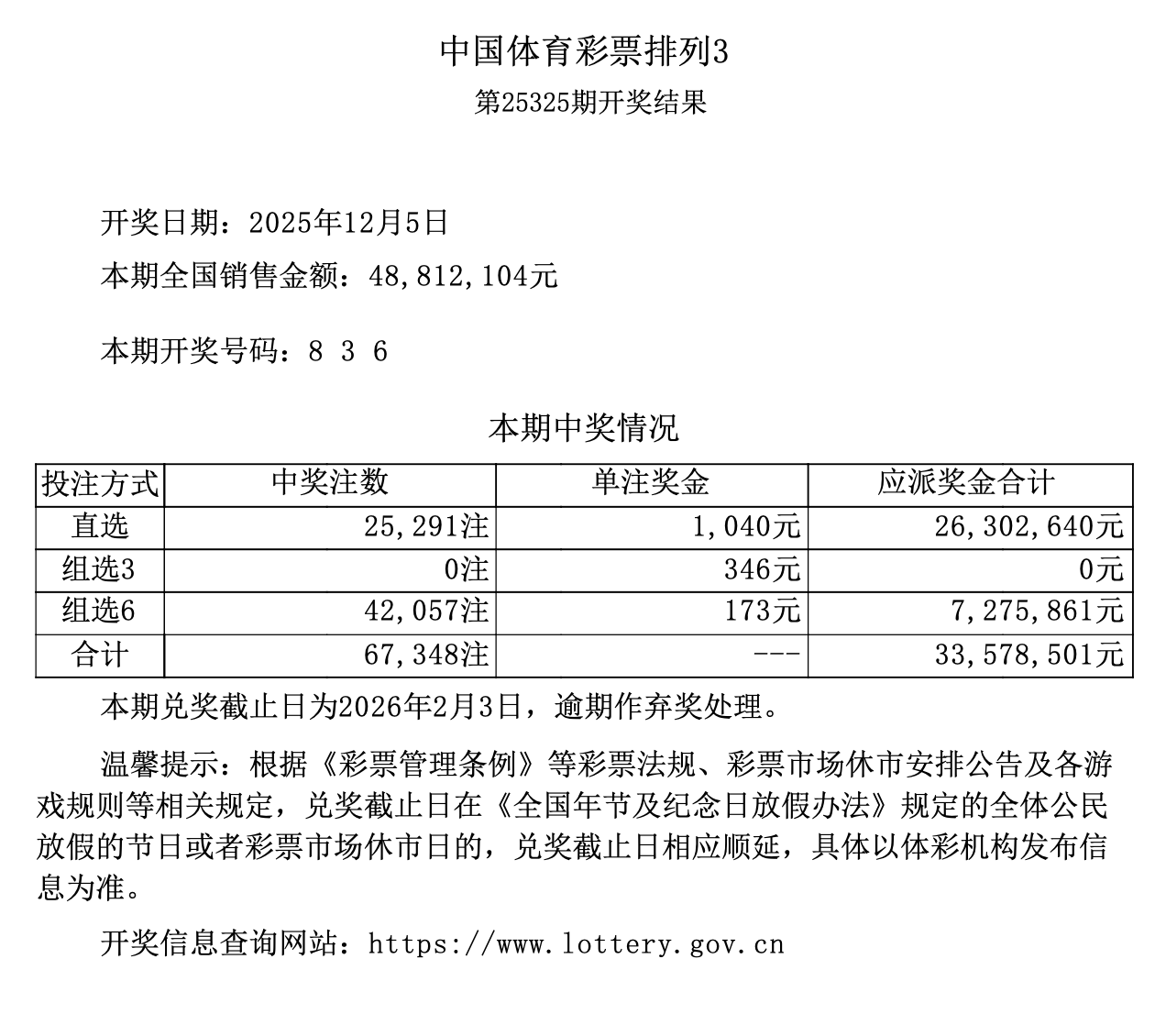 排列3 第25325期开奖 8 3 6