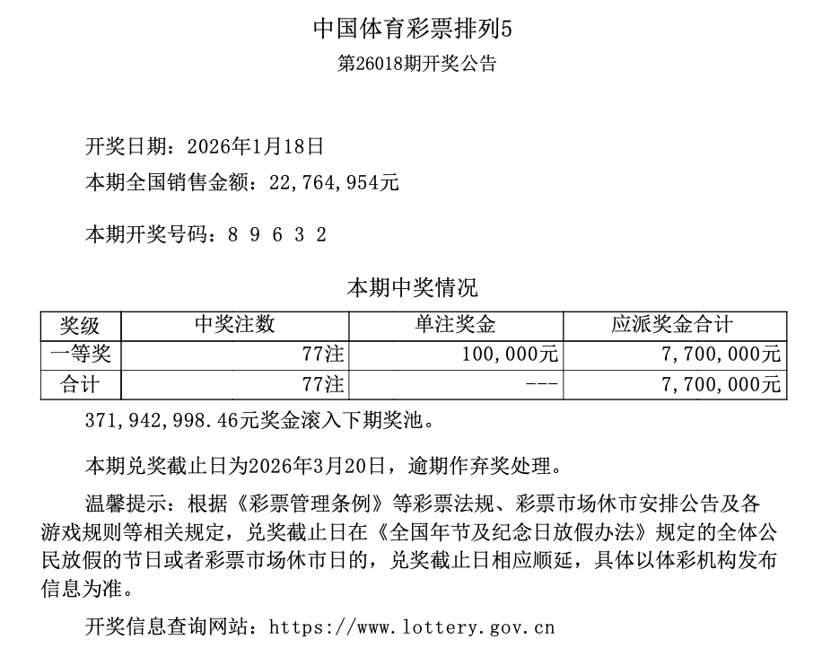 排列5 第26018期开奖 8 9 6 3 2